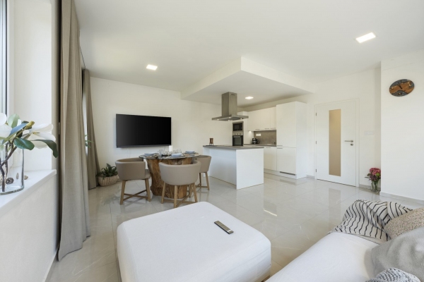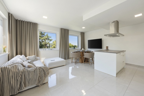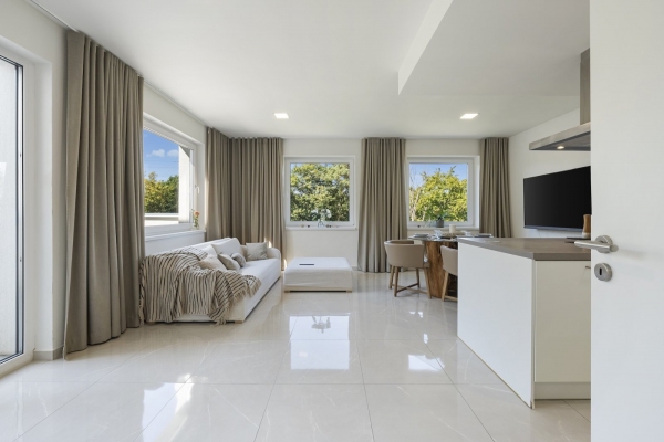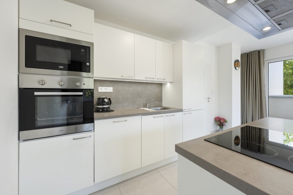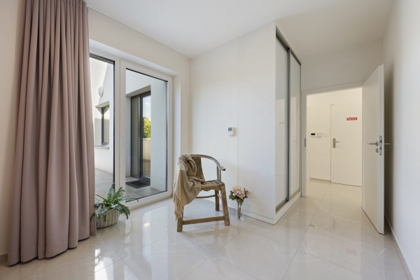 Byt nabízí prostornou vstupní halu, odkud jsou samostatné vstupy do všech místností. Velkorysý obývací pokoj s kuchyňským koutem a ostrůvkem, vytváří dokonalý rodinný a víceúčelový prostor pro různá setkávání. Přilehlá terasa je přístupná jak z obývacího pokoje, tak z ložnice, a nabízí příjemné a pohodlné místo k relaxaci či odpočinku na čerstvém vzduchu s výhledem do zeleně.
