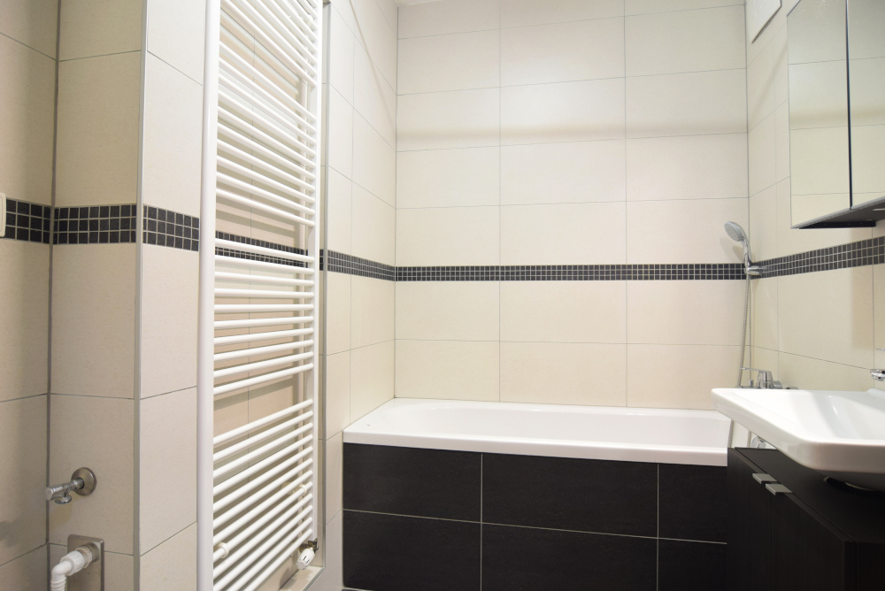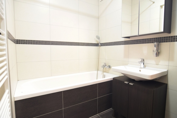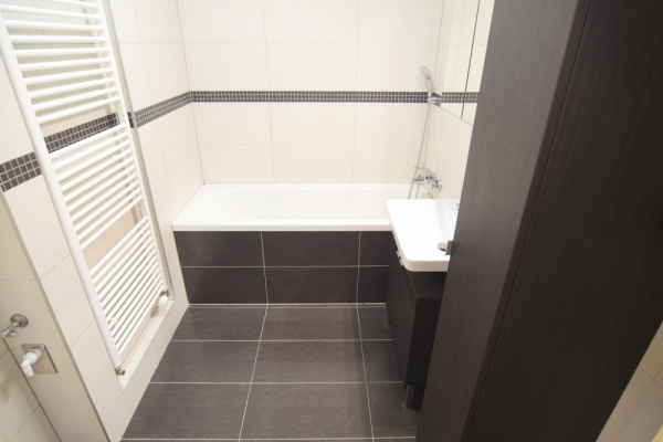 - Koupelna (4 m2) vybavená vanou, umyvadlem se skříňkou, samostatnou koupelnovou skříňkou, topným žebříkem, přípojkou na pračku.