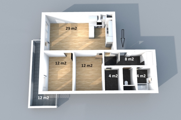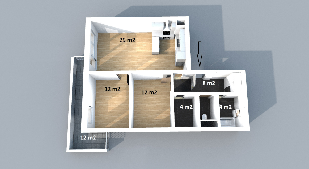 - Třetí pokoj rovněž nabízí podlahovou plochu 12 m2.