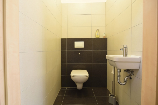 - Toaleta se závěsným WC a praktickým umyvadlem.