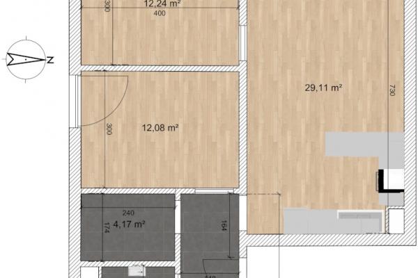- Plovoucí podlaha v obytných místnostech, dlažba v chodbě, komoře a koupelně.