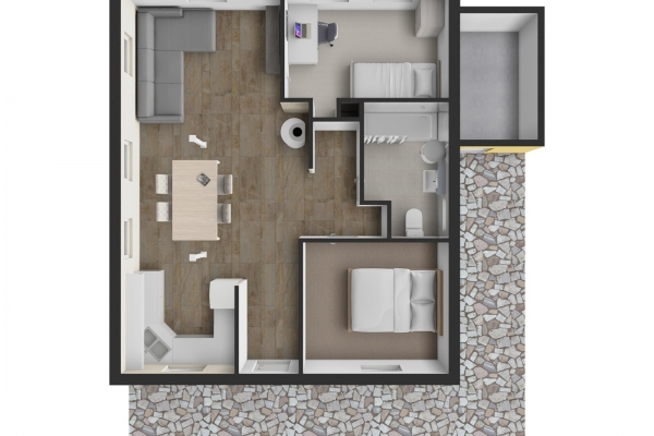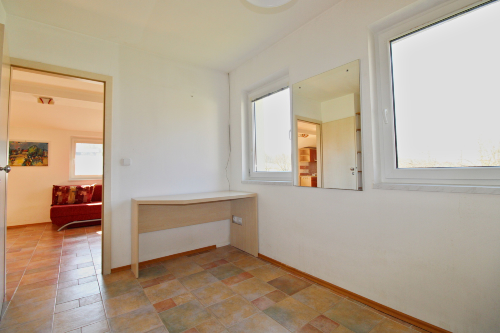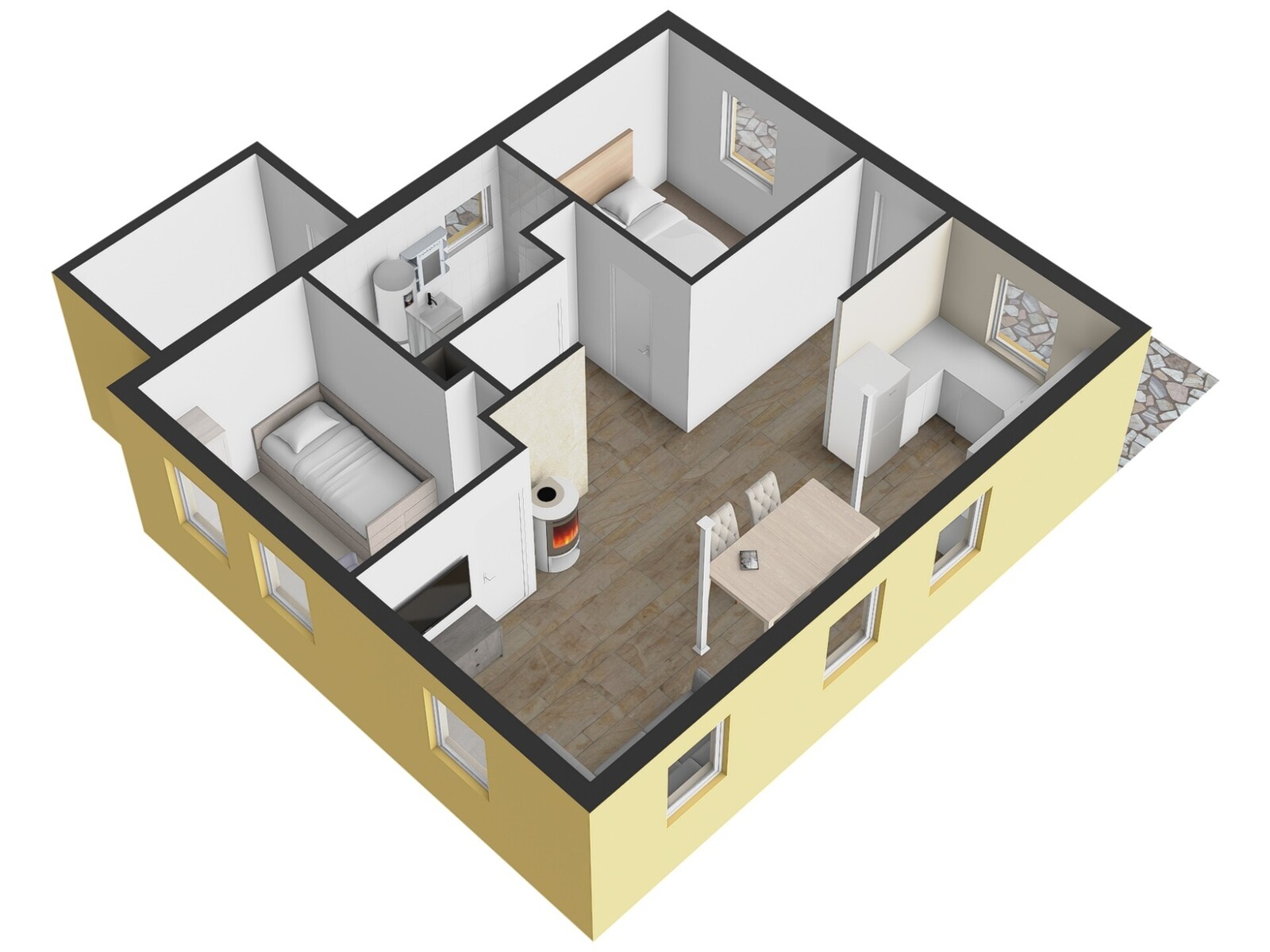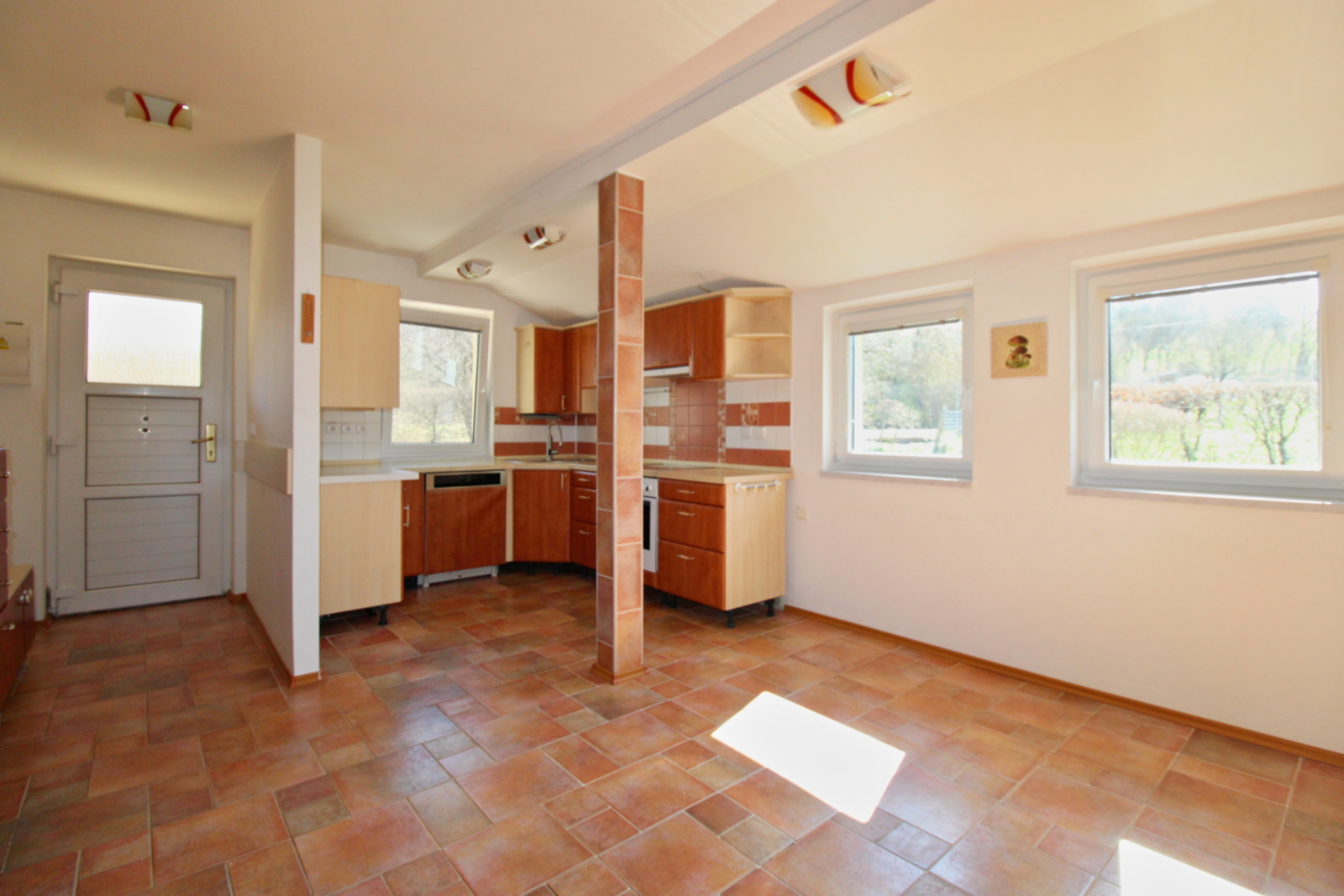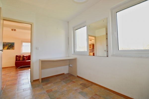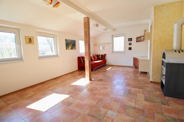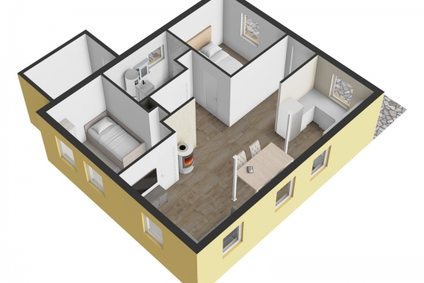 Hlavní obytná místnost navazující na kuchyňský kout tvoří jádro domu. Z prostorného obýváku je přístup do dvou samostatných pokojů a koupelny spojené s wc. Vně domu se nachází dílna.