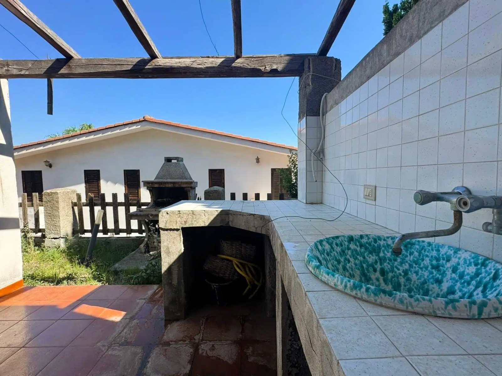 Komfort doplňuje venkovní sprcha, zděný gril a připravené rozvody pro instalaci venkovní indukční kuchyně.